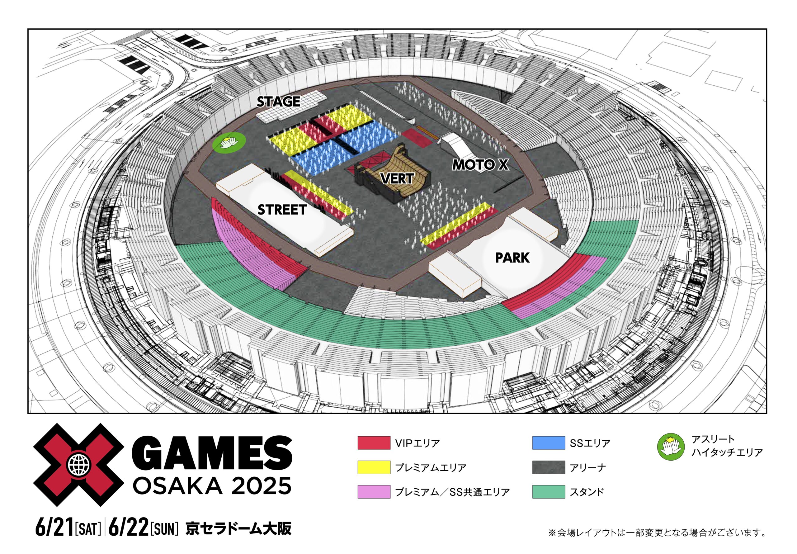 名 称(英 語):X Games Osaka 2025 名 称(日本語):Xゲームズ大阪2025 名 称(読み方):エックスゲームズ オオサカ ニセンニジュウゴ 日 程: 6月20日(金)【公式練習】 6月21日(土)【決勝】 開場9:30 / 開演9:45 / 終演20:00 予定 ✖️女子 スケートボード ストリート ✖️男子 スケートボード バート ✖️女子 スケートボード バート ✖️BMX パーク ✖️BMX パーク ベストトリック ✖️Moto X ベストトリック 6月22日(日)【決勝】 開場9:30 / 開演9:45 / 終演19:15 予定 ✖️男子 スケートボード ストリート ✖️男子 スケートボード パーク ✖️女子 スケートボード パーク ✖️男子 スケートボード バート ベストトリック ✖️BMX ストリート ✖️BMX フラットランド ✖️Moto X デモンストレーション ※金曜は公式練習日のため関係者・招待客・取材媒体のみ。一般入場は土曜と日曜の2日間です。 ※時間は変更となる場合があります。 会 場: 京セラドーム大阪(KYOCERA DOME OSAKA) チケット発売日: 2025年4月8日(火)15時から各プレイガイドにて一般発売(先着順) オンライン購入: