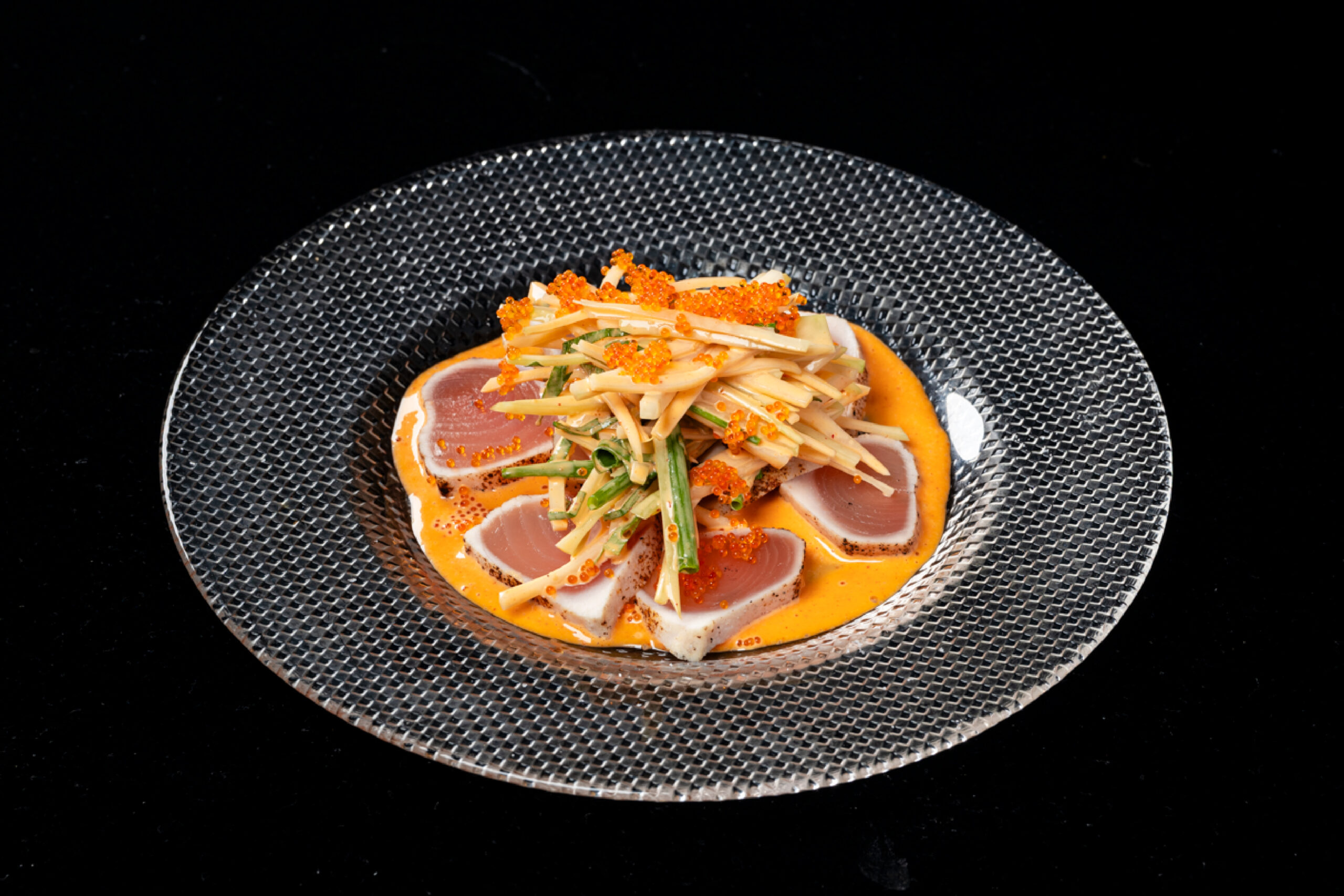 今月の前菜は、備長マグロのたたき。 軽く炙って、旨みを閉じ込めた備長マグロに唐辛子と酢、にんにくを効かせたタイ発祥のチリソース『シラチャー』とアイオリを合わせ、まろやかな辛味とコクを添えました。 とびっこの弾ける食感が軽快なリズムを添える、エスニックのニュアンスをまとった前菜です。