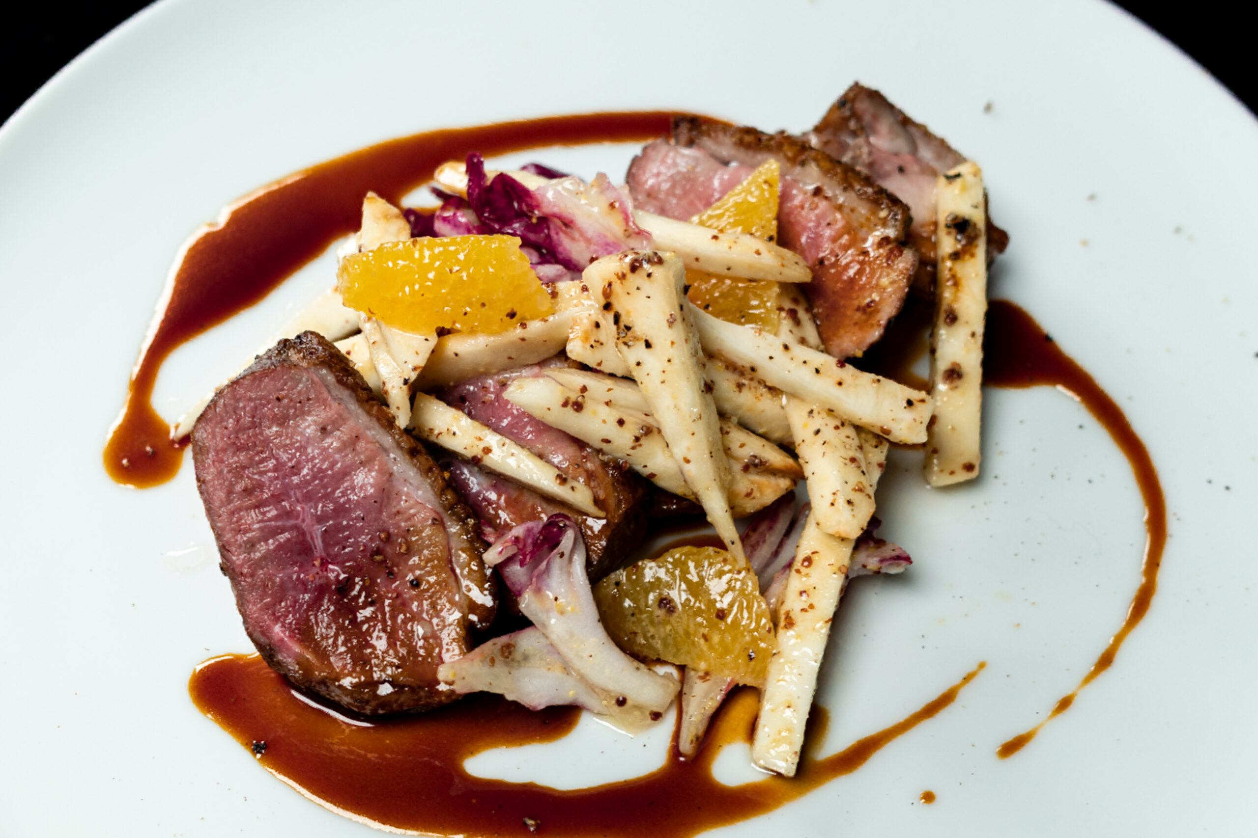 赤身の力強さと上品な脂を併せ持つ京鴨胸肉をじっくりとロースト。 鴨と牛の出汁をベースに、ブラッドオレンジの香りを重ねたソースが、肉の滋味を一層引き立てます。 付け合わせには深い赤紫色が目を引く葉野菜のトレビスとセロリを用いたヴィネグレット。 爽やかな酸味が、噛むほどに広がる鴨の旨味を引き締めます。