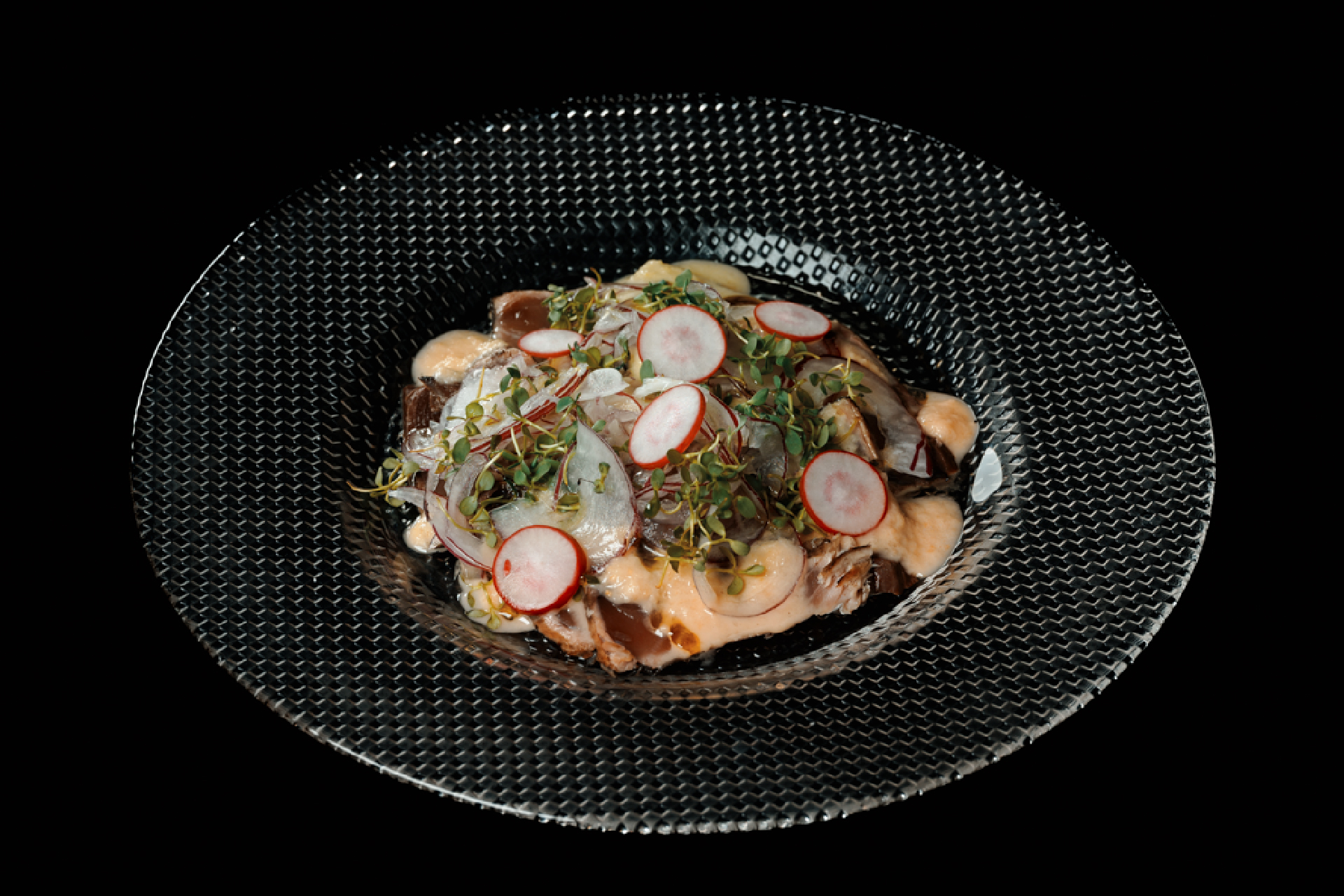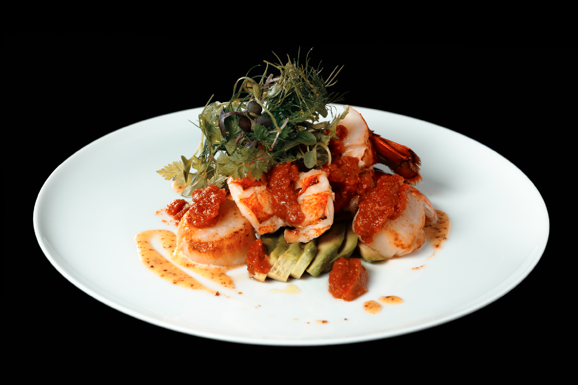 オマール海老と帆立貝を香ばしくソテーし、甲殻類の旨味に寄り添うピリ辛のカクテルソースを添えました。 ほどよい歯ごたえと甘みを湛えたふたつの素材は、口に運ぶたびに豊かな旨味がふわりと広がります。 カクテルソースのほどよい辛味が全体を引き締め、味わいに奥行きを添える逸品です。